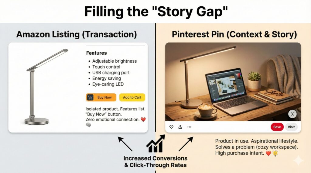 Amazon is built for transactions. Pinterest is built for context. Showing a product inside a home environment or alongside complementary items creates a visual story that increases Amazon clickthrough rates and conversions.