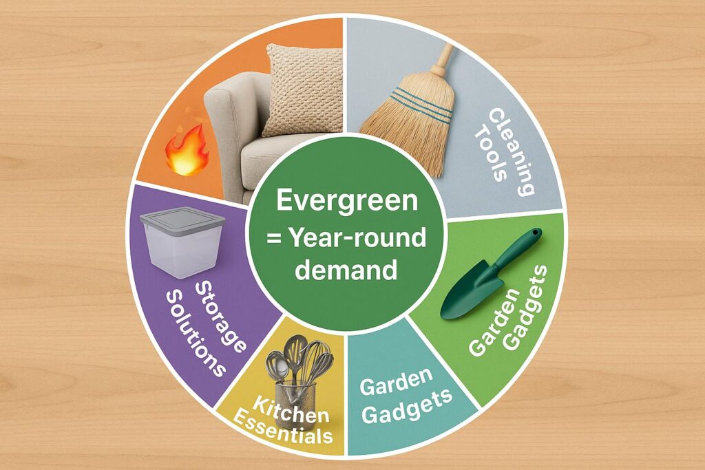 Evergreen means durable demand. These are products people need year in and year out: cleaning tools, storage solutions, small home/garden gadgets, organizational systems, and home maintenance tools.